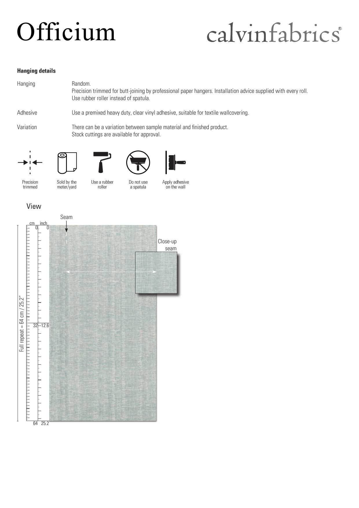 Surface finish: A stain repellent finish prevents waterbased splashes penetrating and staining the material. Periodic vacuuming is recommended to prevent dust from building up on the materials surface.